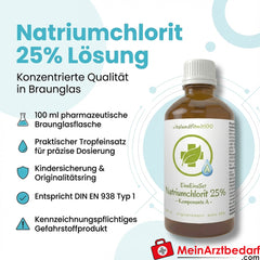 Contenuto della fornitura: 1 soluzione di clorito di sodio al 25 % (NaClO2), 100 ml, flacone farmaceutico in vetro ambrato con inserto contagocce e tappo a prova di bambino con anello antimanomissione. Produttore: Vitalundfitmit100