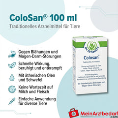 ColoSan vet è un medicinale di provata efficacia per il rapido sollievo della flatulenza legata all'alimentazione e dei disturbi gastrointestinali nel bestiame e nei piccoli animali, cani e gatti. La combinazione di oli essenziali e zolfo lenisce e allevia i crampi del tratto gastrointestinale; ben tollerato, senza periodi di sospensione per latte e carne.
