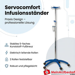 Il supporto per infusione Servocomfort di colore blu offre una soluzione pratica per cliniche, ambulatori e assistenza mobile. La struttura robusta, le rotelle a conduzione elettrica e le due ruote bloccabili garantiscono un supporto sicuro e una gestione affidabile nella pratica quotidiana.