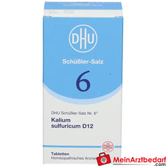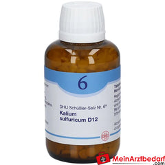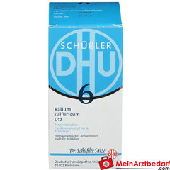 DHU Schuessler Salt No. 6 D12 è un medicinale omeopatico registrato in compresse con il principio attivo potassium sulphuricum in diluizione omeopatica. È adatto all'uso di supporto nell'ambito dei concetti di terapia omeopatica e viene utilizzato da molti anni. Contiene lattosio e amido di frumento.