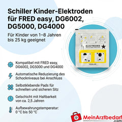 Contenuto della fornitura: 1 paio di elettrodi pediatrici Schiller per FRED easy, DG6002/DG5000/DG4000 (1-8 anni, fino a 25 kg), autoadesivi - Produttore: Schiller