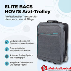 Contenuto della fornitura: 1 carrello medico Elite Bags HOVI'S, grigio screziato (34 × 47 × 18 mm) con 5 borse modulari rimovibili, tra cui 1 contenitore per fiale isolato termicamente; inoltre 1 borsa termica GEL e 1 contenitore per rifiuti CONBIO'S - Produttore: Elite Bags.