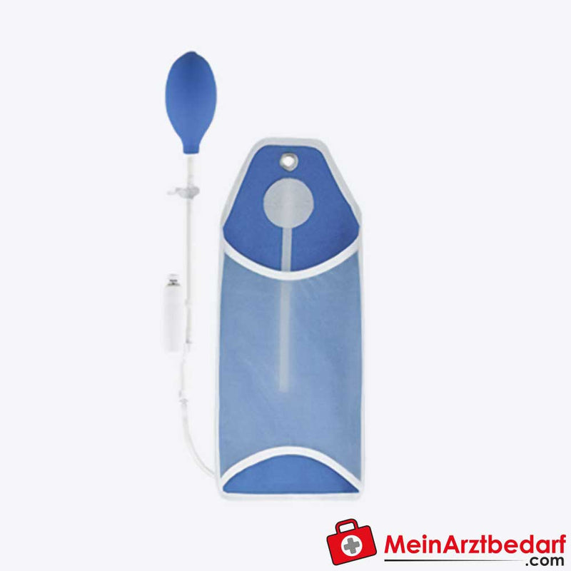 Bracciale per infusione pressurizzato monouso per la somministrazione sicura e igienica di soluzioni di irrigazione e infusione in ospedali, servizi di emergenza e ambulatori. La sacca trasparente, il soffiatore manuale integrato e l'indicatore di pressione consentono un'applicazione controllata e una rapida sostituzione.