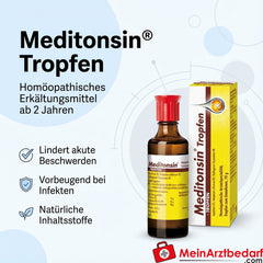 - Foto simbolo - Dimensioni della confezione come da descrizione - Effetto olistico contro il raffreddore e le infezioni simil-influenzali con principio d'azione omeopatico e ottima tollerabilità. Meditonsin allevia rapidamente i sintomi acuti e fa sì che un raffreddore o un'infezione simil-influenzale non insorgano. Gli ingredienti naturali e l'effetto olistico favoriscono il processo di guarigione senza appesantire l'organismo.