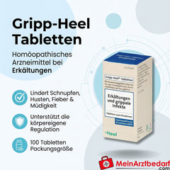 Per raffreddori e infezioni influenzali. - Le compresse GrippHeel alleviano i sintomi di un'infezione simil-influenzale. Alleviano raffreddore, tosse e febbre. Anche la sensazione di spossatezza e stanchezza dovuta a un'infezione influenzale può essere trattata con successo con le compresse GrippHeel. Omeopatia per stimolare la regolazione dell'organismo. Per informazioni sull'effetto e sui possibili effetti indesiderati, consultare il medico o il farmacista.