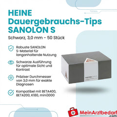 Contenuto della fornitura: 50 pezzi Heine SANOLON S nero, 3,0 mm (punte per otoscopio riutilizzabili) - Produttore: Heine