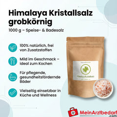Sale cristallino dell'Himalaya a grana grossa (1 kg) - sale da tavola naturale, privo di additivi, dal sapore delicato, adatto per cucinare, condire e per bagni nutrienti. Origine: colline vicino all'Himalaya (Pakistan). Controlli di qualità regolari garantiscono la purezza e la lavorazione.