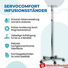 Lo stativo per infusione Servocomfort offre una regolazione in altezza con una sola mano e una sospensione stabile per un massimo di quattro contenitori per infusione. Adatto per ospedali, strutture di cura e applicazioni mobili; design robusto per una facile pulizia e una sicura mobilità dei pazienti.