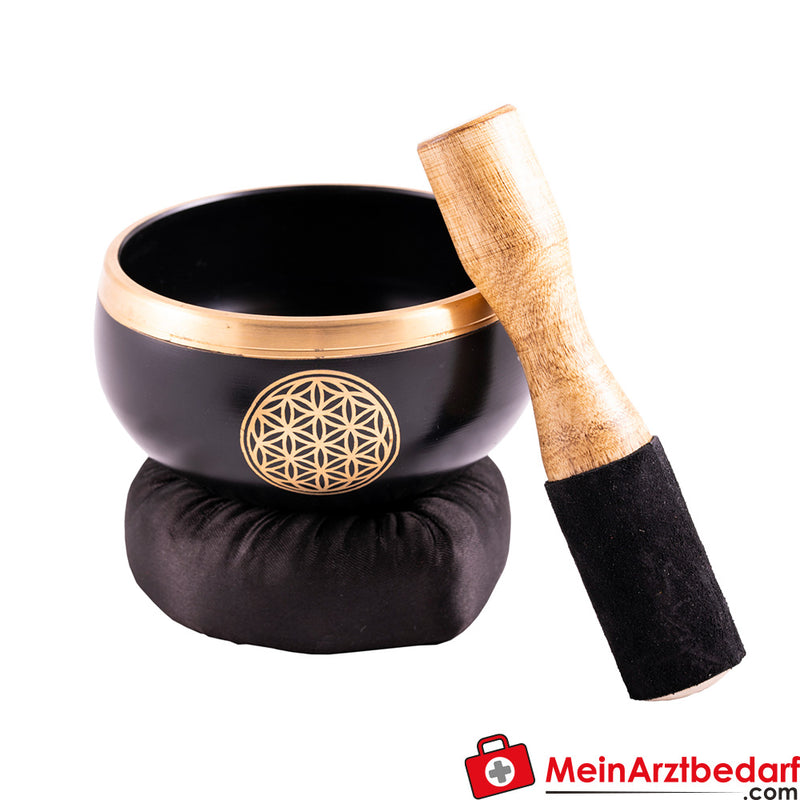 Questa ciotola per il canto non è solo visivamente attraente, ma ha anche un potente effetto vibrazionale. Il Fiore della Vita, simbolo di manifestazione, vibra a ogni giro della singing bowl e aiuta a trovare il proprio centro, a sciogliere i blocchi e a liberare nuova energia vitale. La singing bowl è circondata da tre fiori della vita e ne ha uno grande all'interno e uno sul lato inferiore.