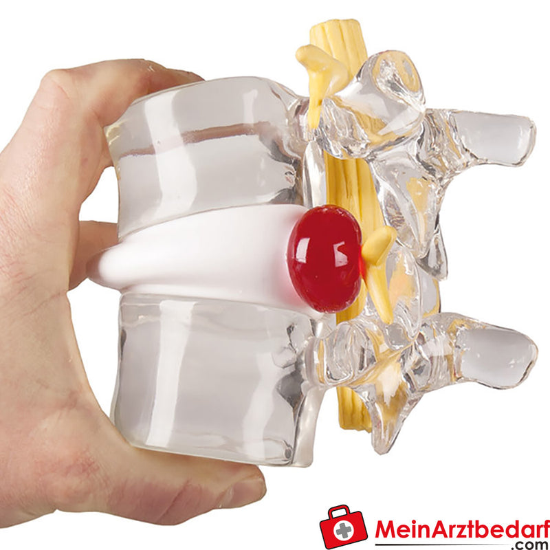 Il simulatore di disco intervertebrale mostra schematicamente due vertebre lombari con un ingrandimento di circa 2 volte. Il modello illustra meccanicamente un'ernia del disco utilizzando un nucleo del disco comprimibile e rende facilmente comprensibili gli effetti sul nervo spinale. Ideale per l'educazione dei pazienti in situazioni individuali e di gruppo, nonché per fisioterapisti e medici professionisti.