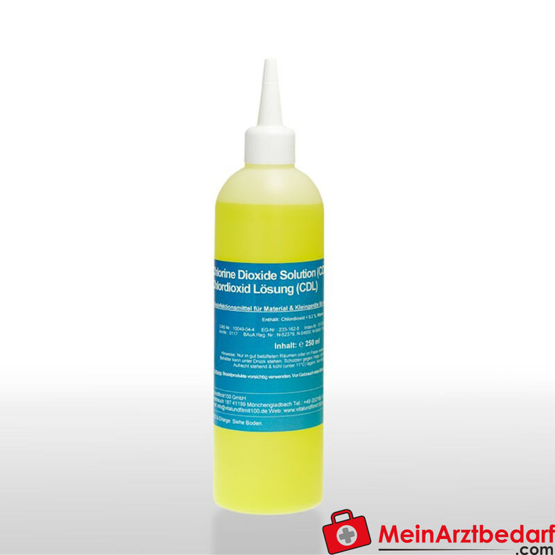 Contenuto della fornitura: 1 flacone di soluzione di biossido di cloro 0,3 % (3.000 ppm), 250 ml, flacone contagocce in HDPE Produttore: Vitalundfitmit100