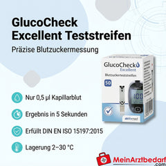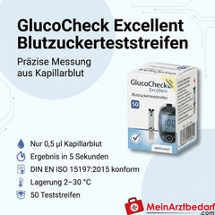 Inserire le strisce reattive solo nel dispositivo di misurazione GlucoCheck Excellent compatibile. Quantità di campione: 0,5 µl di sangue capillare; risultato della misurazione in circa 5 secondi. Display selezionabile in mg/dl o mmol/l. Leggere il foglietto illustrativo e consultare il medico o il farmacista in caso di domande.
