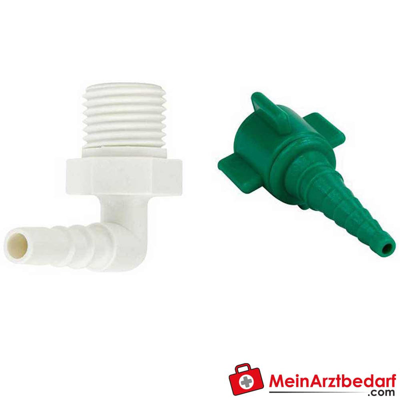 De AEROpart® slangaansluitnozzles zijn verkrijgbaar in twee versies en kunnen draaibaar of star zijn. Ze zijn compatibel met 6 mm slangen. De draaibare slangpilaar heeft een UNF 9/16" binnendraad, de slangpilaar met 90° bocht heeft een UNF 9/16" buitendraad. De draaibare versie is recht, groen en gemaakt van polyoxymethyleen (POM). De haakse slangaansluiting is wit en gemaakt van polybutyleentereftalaat (PBT).
