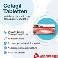 - Symbolische foto - verpakkingsgrootte volgens beschrijving - De ingrediënten in Cefagil zijn afkomstig van de damiana plant (Turnera diffusa), die al door de Azteken zeer gewaardeerd werd als afrodisiacum. Cefagil is verkrijgbaar in de vorm van tabletten en biedt zowel mannen als vrouwen zeer nuttige hulp bij seksuele zwakte. Cefagil werkt op een natuurlijke manier en wordt ook zeer goed verdragen.