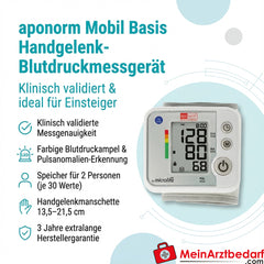 De aponorm Mobil Basis is een compacte polsbloeddrukmeter die geschikt is voor beginners om thuis de bloeddruk te meten. Hij is klinisch gevalideerd, slaat meetresultaten op voor twee gebruikers en biedt een snelle classificatie van de waarden via een kleurendisplay.
