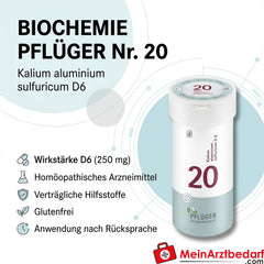 Biochemie Pflüger Nr. 20 Kaliumaluminiumsulfaat D6 is een homeopathisch geneesmiddel in tabletvorm voor gebruik als aanvulling bij overeenkomstige symptomen. Elke tablet bevat 250 mg aluminium kaliumsulfuricum D6; het preparaat is glutenvrij en bevat goed verdraagbare hulpstoffen.