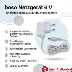 Voedingsunit voor betrouwbare stroomvoorziening van digitale boso medicus bloeddrukmeters - ideaal voor continu gebruik thuis en in de praktijk zonder steeds de batterij te vervangen. Voorwaarde: bestaande voedingsaansluiting op het meetapparaat.