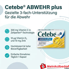 Cetebe® ABWEHR plus biedt drievoudige ondersteuning van de afweer met een combinatie van vitamine C, D en zink. De capsules met Zeitperlen® technologie zorgen voor een continue afgifte van vitamine C gedurende meerdere uren.