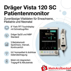 De Dräger Vista 120 SC is een mobiele patiëntmonitor voor spot, interval en continue bewaking van volwassenen, kinderen en pasgeborenen. Hij levert betrouwbare gegevens over vitale functies (SpO2, NIBP) voor klinische besluitvormingsprocessen en kan draadloos worden geïntegreerd in centrale monitoringsystemen.