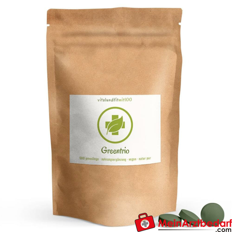 Leveringsomvang: 1 pak, 500 st. GreenTrio Tabs 250 mg spirulina/chlorella/gerstegras pellets Fabrikant: Vitalundfitmit100