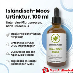 IJslands mos moedertinctuur in een flesje van 100 ml, geproduceerd volgens traditionele alchemistische principes. Pure natuurlijke plantenessence voor eenvoudige toepassing als vloeibaar preparaat; geschikt voor consumenten.