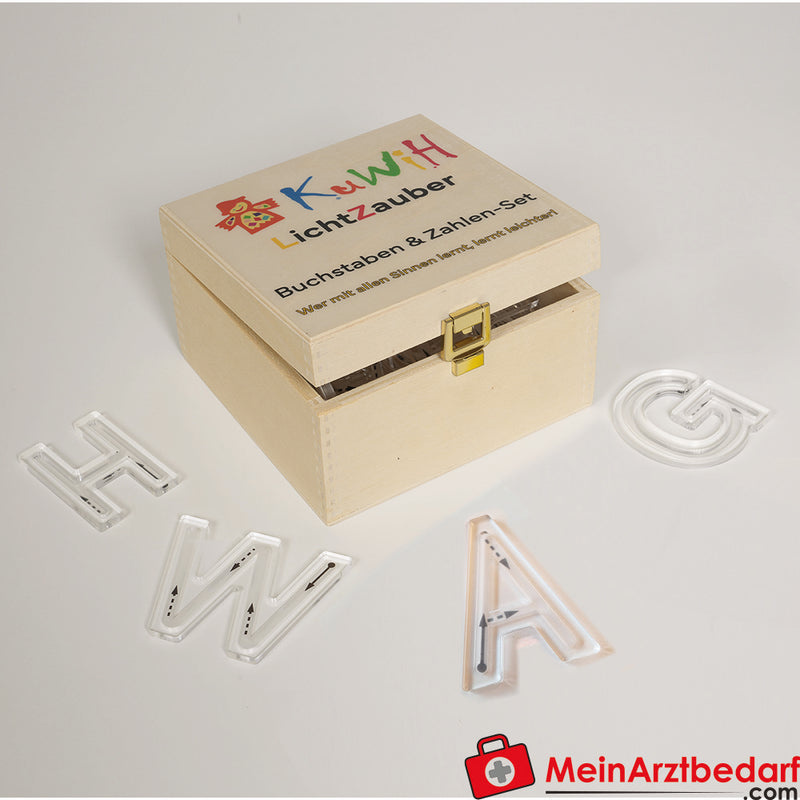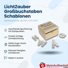 Spelenderwijs leren schrijven met licht: de KuWiH LichtZauber sjablonenset voor hoofdletters helpt kinderen bij het herkennen en overtrekken van lettervormen. De combinatie van lichtgevend overtrekken, startpunten en richtingspijlen bevordert schrijfrichting, potlood vasthouden en fijne motoriek.