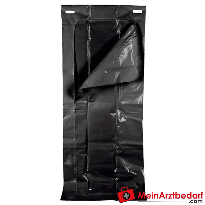 Leveringsomvang: 1 st. Standaard lijkhoes 2340 x 900 mm, 0,18 mm, met 4 handgrepen en dubbele wikkelsluiting (C-vorm).