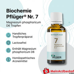 Leveringsomvang: 1 flesje Biochemie Pflüger® No. 7 Magnesium phosphoricum D6 druppels (1000 mg werkzame stof, druppels, 32% vol.-% alcohol) - Fabrikant: Biochemie Pflüger®