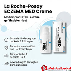 ECZEMA MED Crème van La Roche is een medisch hulpmiddel voor de ondersteunende verzorging van de eczeemgevoelige, gevoelige en atopische huid. De crème verlicht symptomen zoals jeuk, roodheid en irritatie en bevordert een evenwichtig huidmicrobioom.