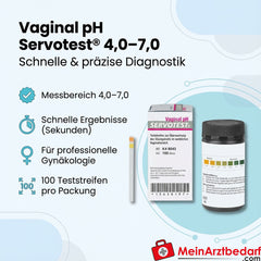 Servotest indicatorstrips voor een snelle, betrouwbare bepaling van de vaginale pH-waarde in het bereik 4,0-7,0. Ontwikkeld voor professionele gynaecologische in-vitrodiagnostiek; ook veelzijdig te gebruiken voor industriële controletaken.