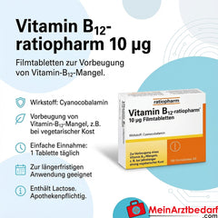 Vitamine-B12-ratiopharm® 10 µg filmomhulde tabletten. Werkzame stof: cyanocobalamine. Indicaties: Preventie van vitamine B12-tekort als gevolg van jarenlange deficiëntie en ondervoeding. Waarschuwing: Filmomhulde tabletten bevatten lactose! Alleen verkrijgbaar in de apotheek. Lees voor risico's en bijwerkingen de bijsluiter en vraag uw arts of apotheker.