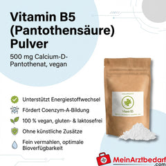 Leveringsomvang: 1 pak vitamine B5 (pantotheenzuur) poeder, 100 g, calcium D-pantothenaat 500 mg per aanbevolen dagelijkse dosis, veganistisch. Fabrikant: Vitalundfitmit100