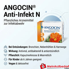 ANGOCIN® Anti-Infekt N to lek ziołowy stosowany od dziesięcioleci w celu łagodzenia objawów zapalenia oskrzeli, zapalenia zatok i zapalenia pęcherza moczowego. Olejki gorczycowe z nasturcji i chrzanu mają działanie przeciwzapalne, przeciwwirusowe i przeciwbakteryjne, bezpośrednio zwalczają patogeny i przyczyniają się do zmniejszenia oporności na antybiotyki.