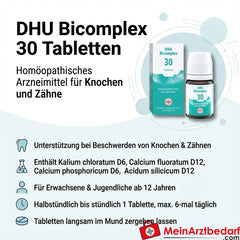 Zakres dostawy: 30 tabletek DHU Bicomplex, każda tabletka 25 mg (Potassium chloratum D6 / Calcium fluoratum D12 / Calcium phosphoricum D6 / Acidum silicicum D12) - Producent: DHU