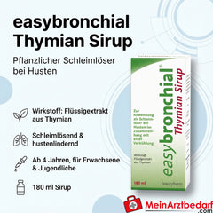 easybronchial Syrop tymiankowy to tradycyjny produkt leczniczy roślinny przeznaczony do stosowania jako środek wykrztuśny w kaszlu związanym z przeziębieniem. Nie zaleca się stosowania u dzieci w wieku poniżej 4 lat, ponieważ należy zasięgnąć porady lekarza. Ze względu na zawartość alkoholu nie może być stosowany u niemowląt i małych dzieci w wieku poniżej 2 lat. W przypadku gorączki, duszności lub ropnej plwociny należy skonsultować się z lekarzem.