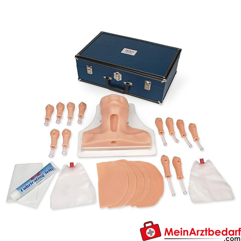 Zakres dostawy: 1 × symulator koniotomii Erler Zimmer z płytą podstawy, 6 skórek szyjnych, 12 wkładek do tchawicy (6 dorosłych: 2 miękkie, 4 twarde; 6 dzieci: 2 miękkie, 4 twarde), 2 sztuczne płuca, instrukcja obsługi i futerał - Producent: Erler Zimmer.