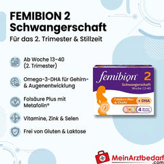 Femibion 2 wspiera przyszłe matki od 13. do 40. tygodnia ciąży dzięki zbilansowanej kombinacji składników odżywczych uzupełniających dietę w 2. trymestrze ciąży. Formuła zawiera omega-3 DHA, kwas foliowy Plus (Metafolin®), a także ważne witaminy i pierwiastki śladowe.