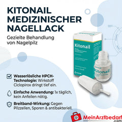 Lakier do paznokci przeciw grzybicy paznokci z aktywnym składnikiem Ciclopirox - Zdjęcie symbolu - Wielkość opakowania zgodna z opisem - Kitonail to medyczny lakier do paznokci do leczenia grzybicy paznokci. Hand und Fuß Kitonail to jedyny rozpuszczalny w wodzie przeciwgrzybiczy lakier do paznokci z ciclopiroxem w Austrii. Jest łatwy w użyciu i nie wymaga opiłowywania paznokci. Dłonie i stopy Lakier medyczny ma silne działanie i działa tam, gdzie jest potrzebny, bezpośrednio na wewnętrznej stronie paznokcia. Rozpuszczalny w wodzie lakier przeciwgrzybiczy Kitonail zawdzięcza swoje silne działanie przeciw grzybicy paznokci specjalnej technologii lakierowania. Dostarcza ona aktywny składnik Ciclopirox dokładnie do środka paznokcia. Aplikacja jest niezwykle prosta Nie ma potrzeby spiłowywania paznokci ani stosowania zmywacza do paznokci przed kolejną aplikacją.