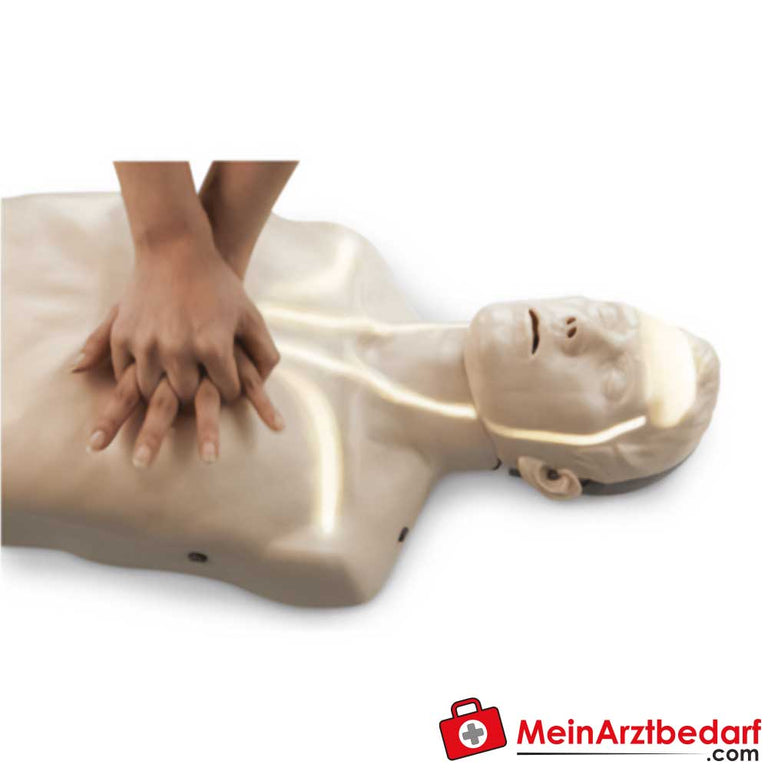 Ten manekin reanimacyjny z zamkniętym tułowiem posiada wskaźnik LED przepływu krwi. Opór dróg oddechowych jest szczególnie realistyczny. Rozmieszczenie elektrod treningowych jest również realistyczne, dzięki czemu ten manekin do resuscytacji zapewnia realistyczną symulację do celów edukacyjnych i szkoleniowych. Manekin jest dostępny z żółtym lub czerwonym wyświetlaczem LED. Manekin jest kompaktowy i łatwy w transporcie. Został wyprodukowany zgodnie z nowymi wytycznymi ERC 2010 i wytycznymi szkoleniowymi dotyczącymi pierwszej pomocy z 2015 roku. Podczas ucisku wyświetlana jest informacja zwrotna za pomocą wskaźnika LED przepływu krwi. W zestawie znajdują się następujące akcesoria: 2 płuca, 2 części twarzowe, 6 baterii i 10 higienicznych masek ochronnych.