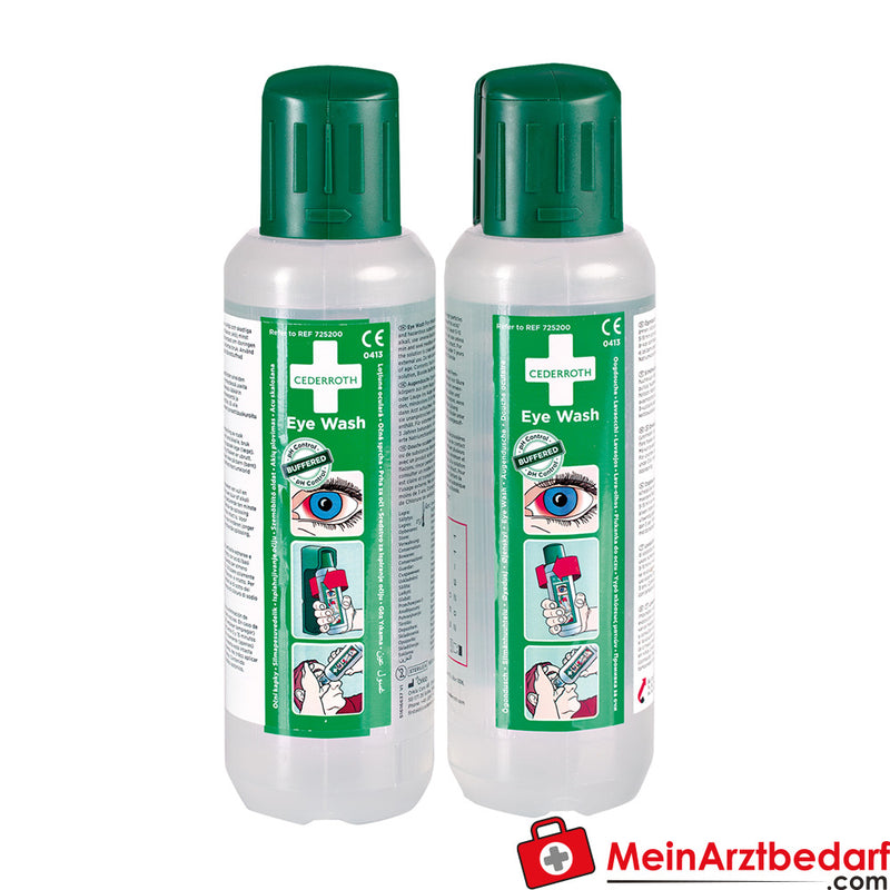 Zakres dostawy: 2 x płukanka do oczu CEDERROTH, sterylny buforowany roztwór, 500 ml każda, ze zintegrowaną muszlą oczną - Producent: CEDERROTH