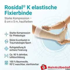 Elastyczny bandaż mocującyRosidal K zapewnia silny ucisk i bezpieczne mocowanie w flebologii, traumatologii i medycynie sportowej. Rozciągliwy, przepuszczający powietrze i wykonany w 100% z bawełny do wielokrotnego prania i stabilizacji parowej.