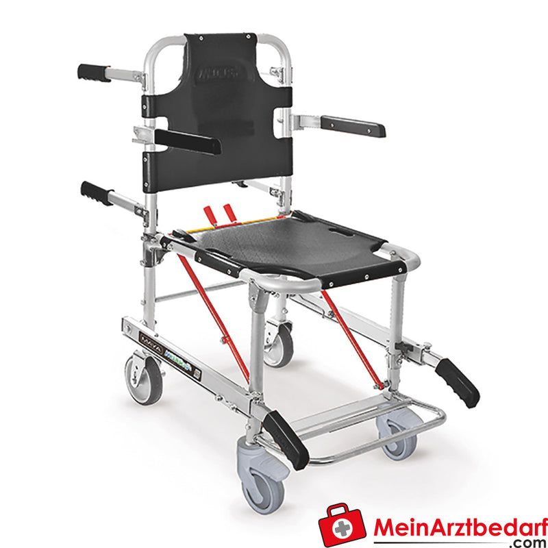 Składane krzesło z noszami do bezpiecznego transportu siedzeń w ograniczonych przestrzeniach. Solidna, płynnie działająca konstrukcja z trzema pasami bezpieczeństwa i wysuwanymi uchwytami do transportu po schodach i transportu pasażerów. Siedzisko i oparcie wykonane z łatwego do czyszczenia tworzywa termoplastycznego; odpowiednie dla personelu ratowniczego, opiekuńczego i ratunkowego.