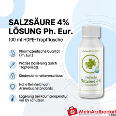 Lieferumfang: 1 Flasche 100 ml Salzsäure 4% Lösung Ph. Eur., HDPE‑Tropfflasche mit Tropfeinsatz und Kindersicherheitsverschluss. Hersteller: Vitalundfitmit100