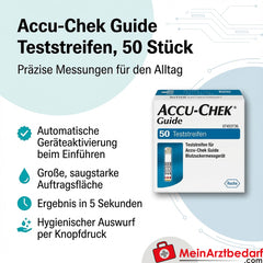 Accu-Chek Guide Teststreifen für zuverlässige Blutzuckermessungen zu Hause und unterwegs. Kompatibel mit Accu‑Chek Guide Messgeräten; schnelle Messung, einfache Blutaufnahme und hygienischer Teststreifen-Auswurf.