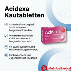 Acidexa® ist ein Arzneimittel aus der Gruppe der Antazida zur Behandlung von Sodbrennen sowie der damit verbundenen Symptome wie Magenbeschwerden und saurem Aufstoßen. - Symbolfoto - Packungsgroesse laut Beschreibung - Calciumcarbonat & Magnesiumcarbonat reagieren mit uberschussiger Magensäure zu löslichen Chloriden.  Calciumcarbonat  wirkt  rasch und  stark  neutralisierend . Diese  Wirkung  wird durch den Zusatz von  Magnesiumcarbonat das ebenfalls  stark   neutralisierend  wirkt  verstärkt . 80 mg Calciumcarbonat 80 mg Magnesiumcarbonat (schwer). Zuckerfrei. Sonstiger Bestandteil mit bekannter Wirkung 299079 mg Xylitol pro Tablette. Rasche Wirkung gegen Sodbrennen Arzneimittel mit bewährter Wirkstoffkombination Bis zu 11 TablettenTag möglich Mit beliebtem Minzgeschmack Zuckerfrei Kle in und Großpackung zur Auswahl (24 bzw. 64 Stuck)