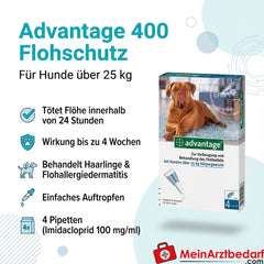 Lieferumfang: 4 Pipetten Advantage 400 Hund, Imidacloprid 100 mg/ml Lösung zum Auftropfen (Packung für Hunde 25–40 kg).