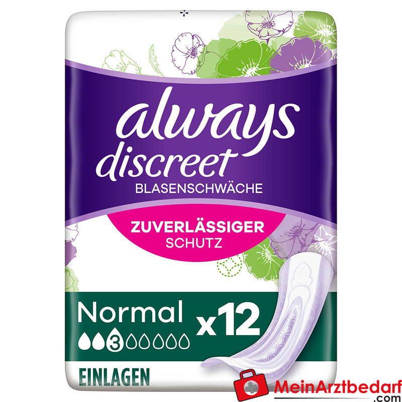 Lieferumfang: Packung mit einzeln verpackten Always Discreet Inkontinenz-Einlagen Normal, ultradünn mit LeakGuard (Stückzahl je nach gewählter Packungsgröße).