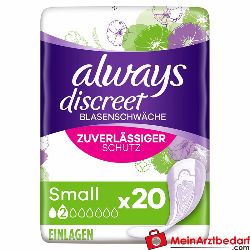 Lieferumfang: einzeln verpackte Always Discreet Inkontinenz-Einlagen Small, Stückzahl entsprechend der gewählten Packungsgröße – Hersteller: Procter & Gamble