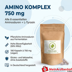 Amino Komplex 750 mg Kapseln, alle 8 essentiellen Aminosäuren + L‑Tyrosin, 180 Stück