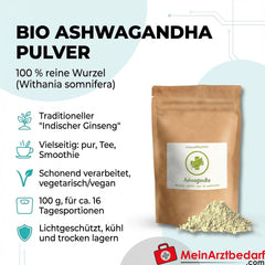 Bio Ashwagandha Wurzelpulver, 100 g – 100 % reine Wurzel der Withania somnifera. Traditionell in der ayurvedischen Anwendung bekannt, vielseitig einsetzbar als Pulver in Getränken oder Speisen. Geeignet für vegetarische und vegane Ernährung. Für Kundinnen und Kunden .